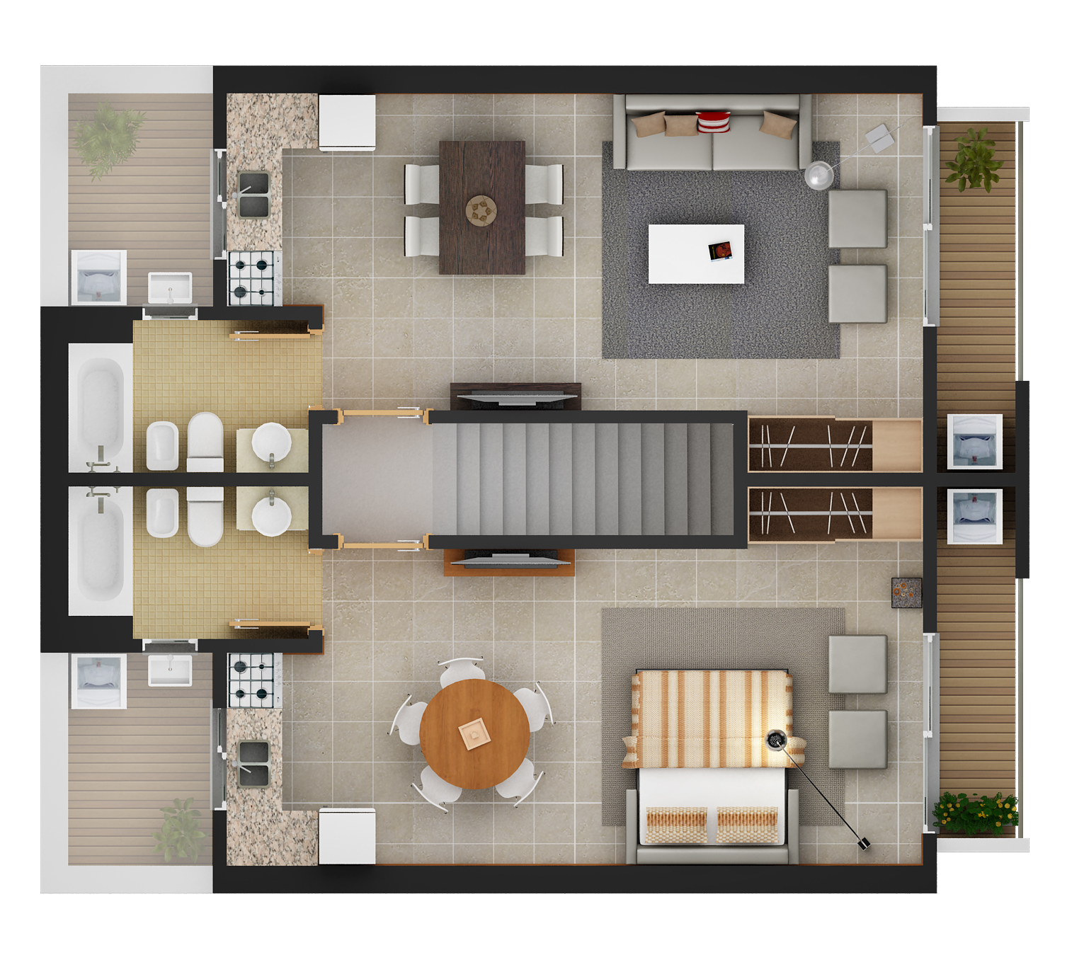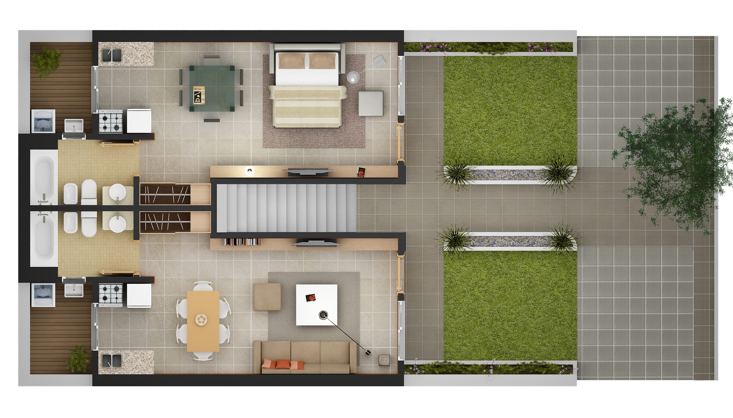Se compone de 4 unidades tipo PH monoambientes. Están distribuidos, 2 en planta baja y 2 en primer piso.